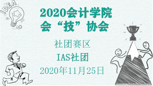 会计学院会“技”协会于2020年11月25日中午12:30举办各专业社团大赛,为积极响应会计学院会“技”协会比赛要求,IAS社团以冬季摄影为主题开展了此次活动。比赛调集了大一及大二的社团成员,此次比赛由IAS指导老师郝雷,社长王艺霖组织策划。会“技”协会总教练王宏老师全程协调。