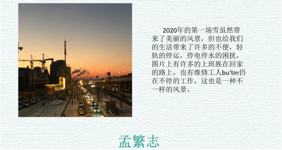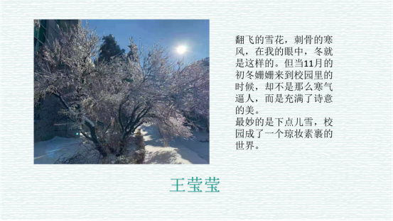 社员们作品内容丰富,用他们手中的相机,独特的视角,记录下冬天的美丽,最终在郝雷老师的悉心指导,认真评选出如下获奖名单:一等奖:2020级财务管理1班孟繁志;二等奖:2020级会计3班张莹、王莹莹;