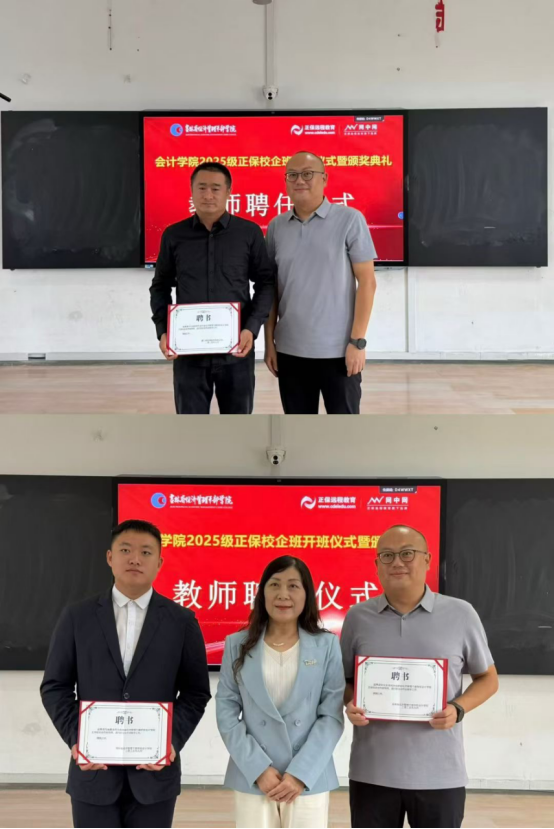 为更深层次推进校企协同育人,打破师资培养壁垒,继续启动校企双方教师双向聘任环节,以师资互通促教学实践融合,为高技能人才培养注入新动能。正保网中网特聘我院兼职辅导员卞云超为企业特聘教师,同时林冬梅院长也诚邀正保网中网吉林省区域经理史法实以及驻校老师马驰展担任学院实践指导老师,以此打造校企双向互动的师资共享平台,旨在凝聚双方优势力量,完善校企协同育人机制,为合作育人进程深化提供有力支撑,进而为会计学院省级特色高水平专业群迈向更高水平提供坚实师资保障。