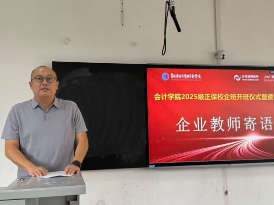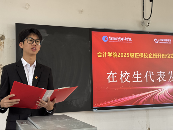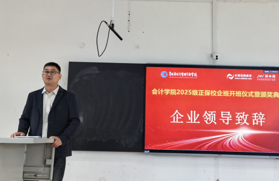 随后,正保网中网史法实经理代表企业教师致辞。他表示,会计学院紧扣时代发展脉络,为提升人才培养品质、创新教育教学模式,主动携手企业共建产业学院并开展协同育人。作为企业导师深知肩负重任,企业将强化实践教学环节,培育学生创新思维,重视职业素养养成,积极为学生搭建就业通道,提供全方位支持。期待同学们珍惜学习机遇,勤勉求知、潜心钻研,以实际行动践行“工匠精神”,为未来职业发展筑牢根基。