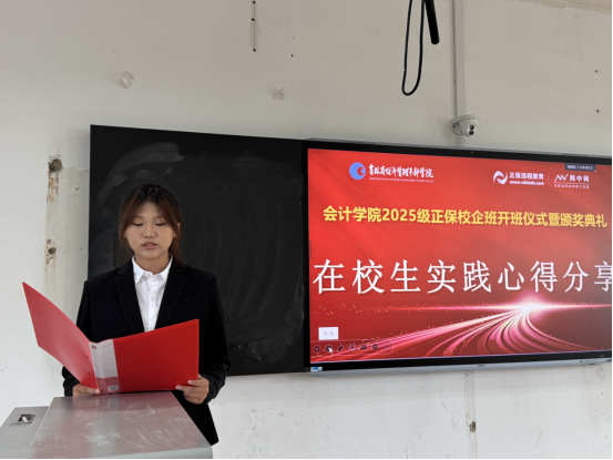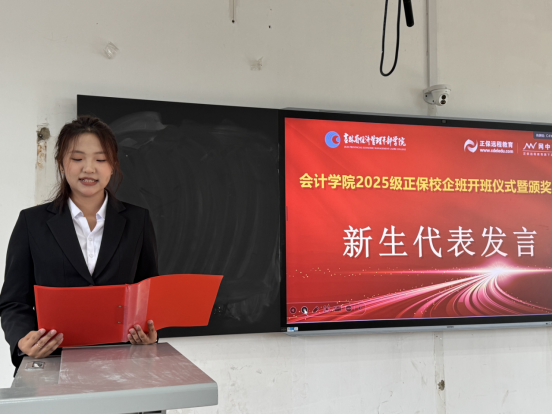 接下来,2025级新生代表黄咏琳分享了军训体验和对未来的展望。她提到军训让她深刻体会到规矩的重要性,即使成功之路充满困难,也会当成最好的安排。2024级大数据与会计(校企合作)2班的邵炜晴同学作为企业实践的优秀学生代表发言。她指出通过财会商圈的综合实训和为期一周的校外实践更加直观地了解企业实务环境、岗位分工以及不同职位的工作内容与流程,不仅提升了学生的综合能力与职业素养,也增强了团队凝聚力。2023级大数据与会计(校企合作)4班的刘骑瑞代表老生发言,他建议学弟学妹们在课堂上深耕专业,把基础打牢;在企业实践中主动探索,把所学用活;更要带着新时代青年的担当,敢想敢闯、敢试敢拼,让青春在 “学思践悟” 中绽放光芒。