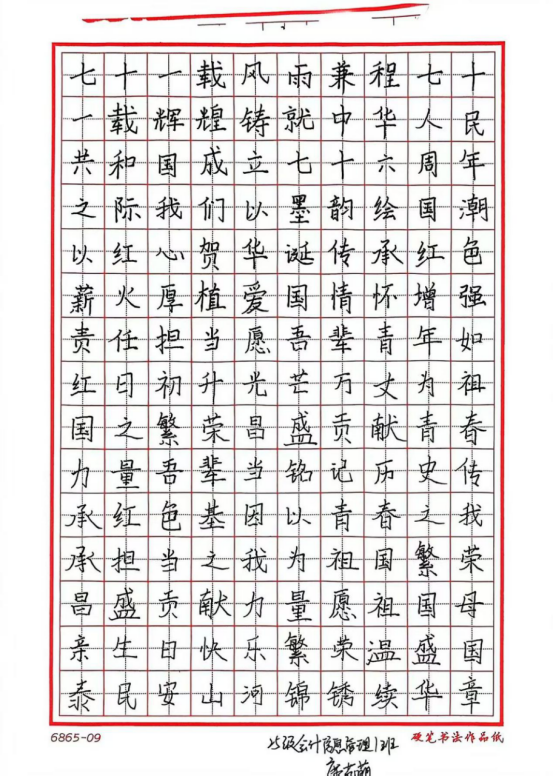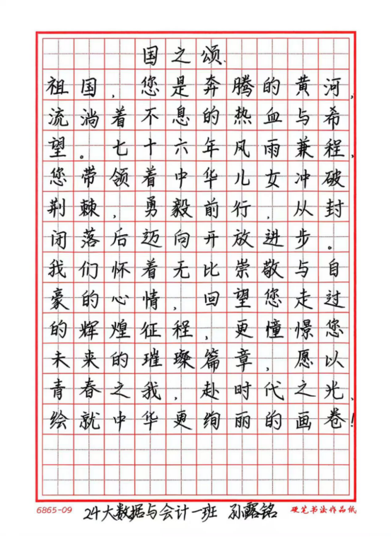 获奖名单的公布,不仅是对同学们创作才华与爱国情怀的肯定,更是本次国庆主题活动的圆满收尾。这些获奖作品中,书法作品笔力遒劲将“家”“国”二字的分量凝于笔尖;绘画作品色彩鲜活把祖国的壮丽山河与时代成就跃然纸上,每一幅都是同学们对祖国76华诞最真挚的献礼,也是中华优秀传统文化与红色基因在校园里的生动传承。会计学院也将以此次比赛为契机,持续开展更多兼具思想性与艺术性的校园文化活动,进一步引导同学们将个人成长与国家发展紧密相连,让爱国情怀扎根心底,让文化自信融入日常,以青春之姿书写新时代的报国之志。