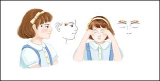 第四节:按揉太阳穴,刮上眼眶。大拇指按于两侧太阳穴上,其它手指自然弯曲,先用大拇指按揉太阳穴,每拍一圈,揉四圈。从眉头刮到眉梢。连刮两次,如此交替做四个八拍。