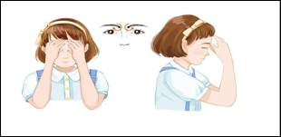 第一节:按揉攒竹穴。双手大拇指按于眉心的穴位处,其余指尖轻触前额,拇指按节拍揉圈,做四个八拍。
