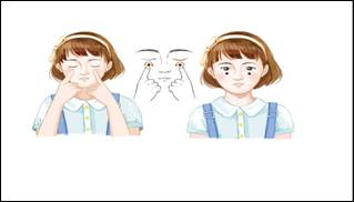 第二节:按压睛明穴。用双手食指分别按在两侧眼窝穴位处,按节奏上下按压,做四个八拍。