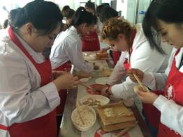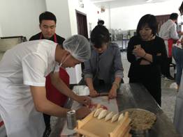 本次活动由长春喜家德水饺人事主管王宇婷主持,首先为同学们介绍了企业历史和文化、企业用人标准和未来发展方向,站在专业人力资源的角度提醒学生们要具备吃苦耐劳的精神;然后由店面优秀训导师展示面案技巧并进行现场教学,同学们不禁纷纷拍照和感叹师傅技艺的高超;最后师生共同体验包饺子的过程,依据面和馅比例、饺子形状等指标评出优秀同学,整个活动在轻松愉悦的氛围中结束,为同学们带来了一场别开生面的饺子“盛宴”。