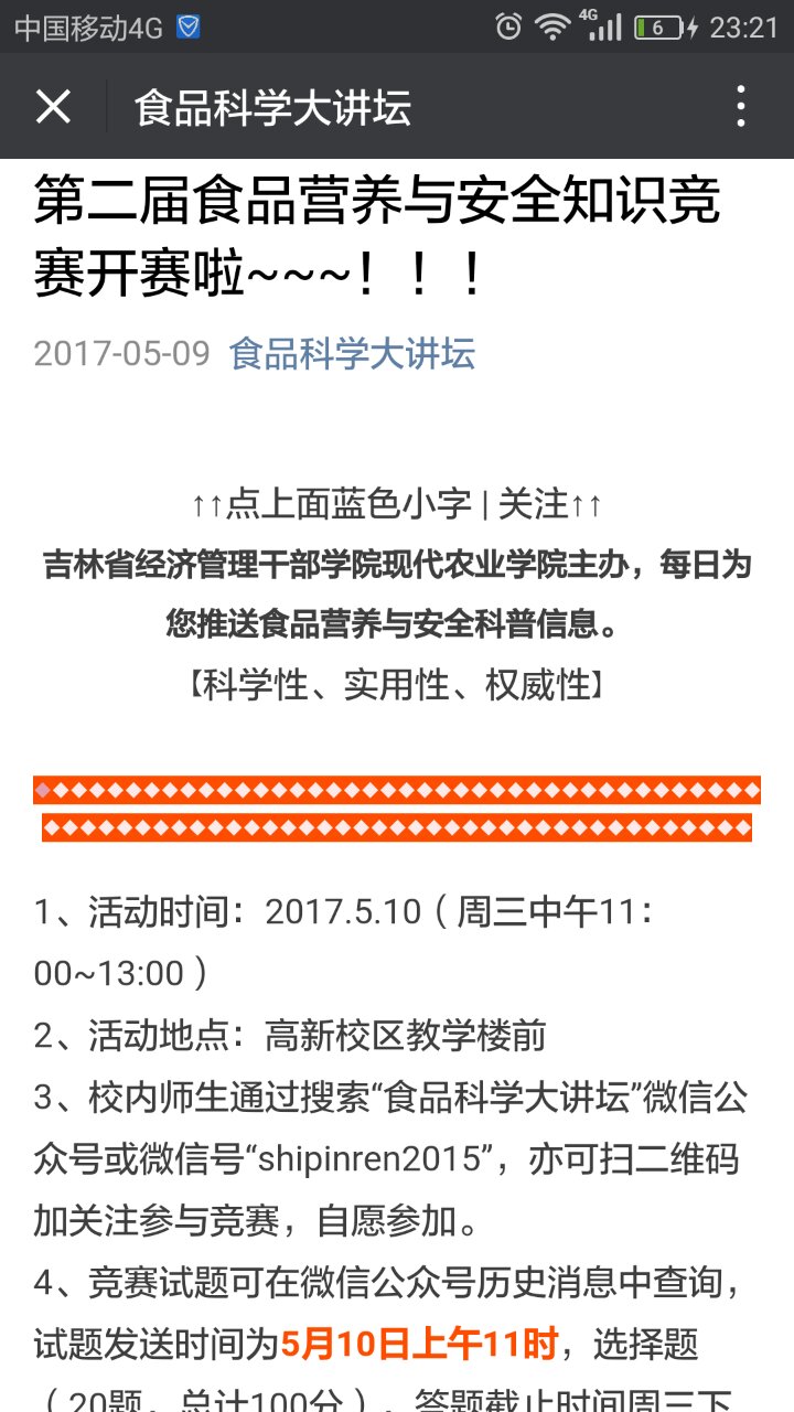 为增强学院专业教育的吸引力、凝聚力和创造力,按照学院《2017年职业教育宣传月活动方案》安排,结合本部门实际,5月10日中午现代农业学院于高新校区教学楼一楼文化长廊组织学院2015级、2016级全体学生开展食品营养与安全知识竞赛活动。