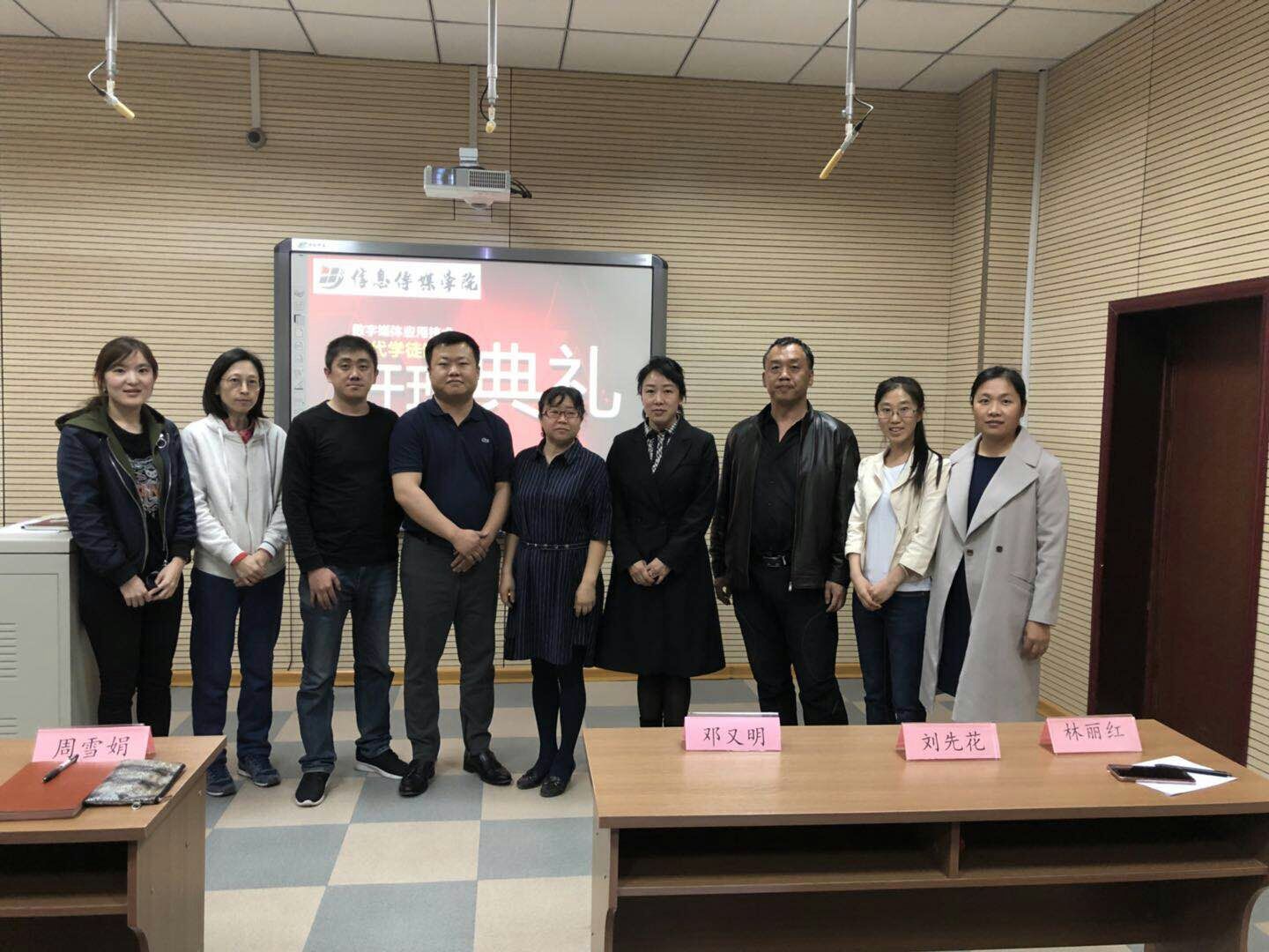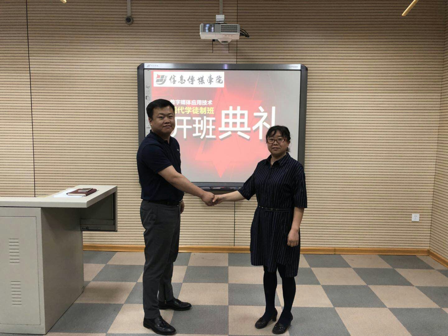 2018年5月9日,信息传媒学院在院部A教401举行数字媒体应用技术专业现代学徒制班开班典礼。吉林省冉晟科技有限公司总经理孙贺、总导演王刚,信息传媒学院院长刘庆红、总支书记周雪娟、副院长邓又明出席了会议。参加会议的还有数字媒体应用技术专业的杨兴越老师、林丽红老师以及張飛飛老师。学徒制试点班---2016级数字媒体应用技术专业全体同学参加了开班典礼。会议由数字媒体应用技术专业负责人刘先花老师主持。