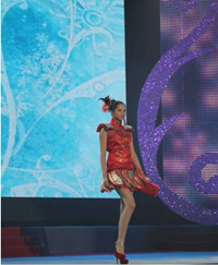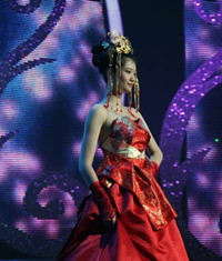 作品《宫廷嫁衣》以中国传统的红色为主色,采用丝绸材质表现,洋溢着浓浓的宫廷气息和喜气气氛。款式灵感源于中国传统服饰凤冠霞帔,图案采用明清时期官服上的补子纹样配以珠绣展现中华传统风格,作品曲线玲珑、线条流畅,富有韵味。