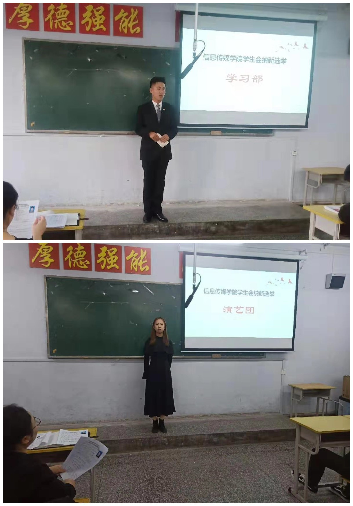 为进一步做好学院学生工作,充实学生干部队伍,发挥学生干部桥梁纽带作用,践行“全心全意为同学服务”的宗旨,10月底,信息传媒学院学生组织在A教301举行纳新活动。团总支书记刘庆老师、辅导员赵倩老师参加了此次纳新。