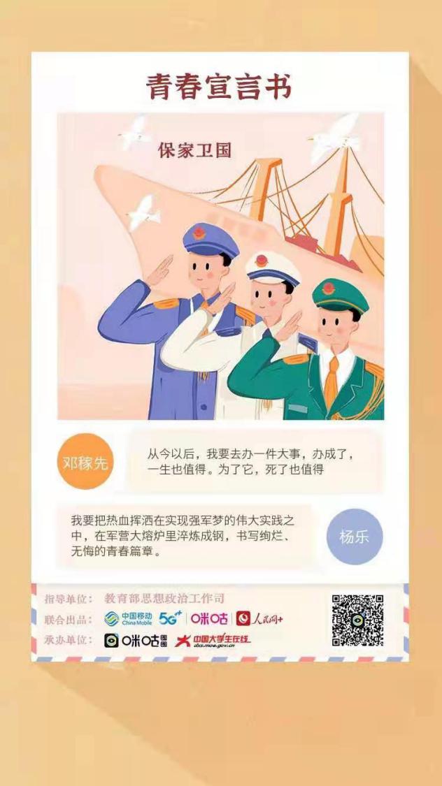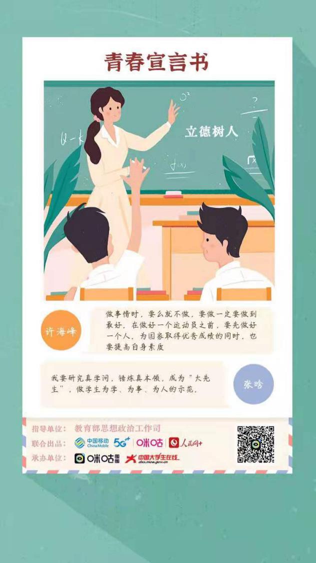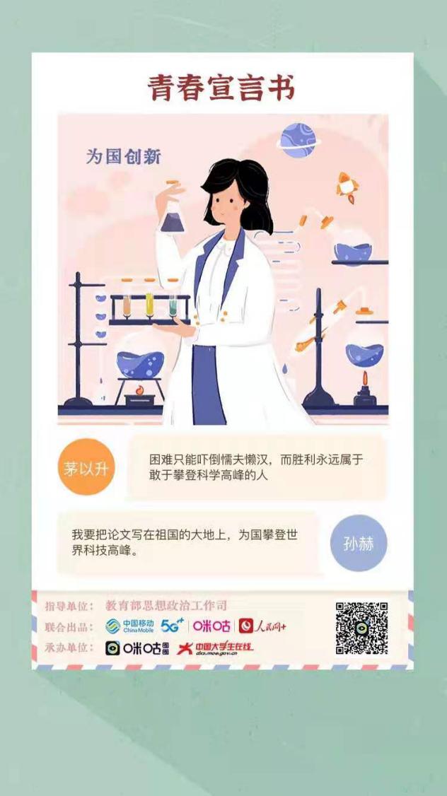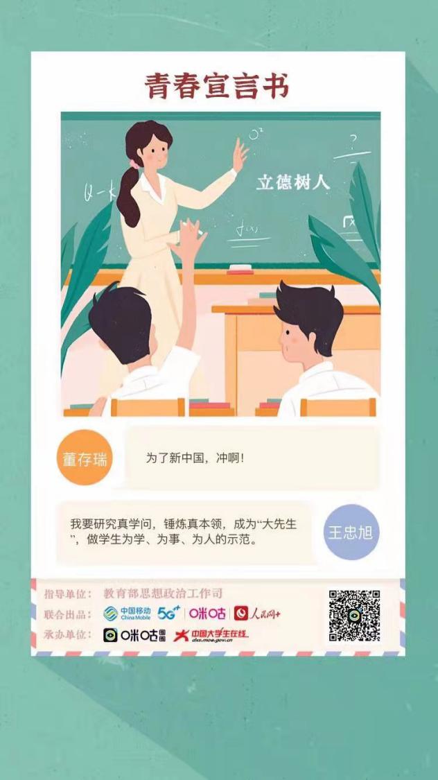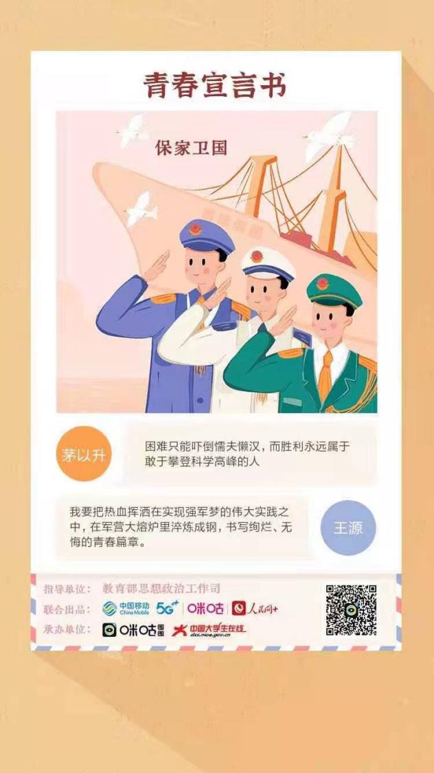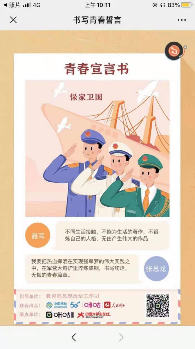 为深入学习贯彻习近平新时代中国特色社会主义思想,弘扬“爱国、进步、民主、科学”的五四精神,推进“四史”学习教育,以党的故事、革命的故事、英雄的故事激励和引领我院广大青年不忘初心、砥砺奋进,信息传媒学院团总支积极响应院团委的号召,开展了“生逢盛世不忘历史 肩负重任奋进担当”五四青年节特别主题团日线上活动,同学们通过微信、微博、人民网APP等方式在线参与活动,在教育部思政司指导、人民网与中国移动咪咕联合出品的“生逢盛世不忘历史 肩负重任奋进担当”H5在线书写自己的青春誓言,把青春热情挥洒在新时代的青春舞台上。