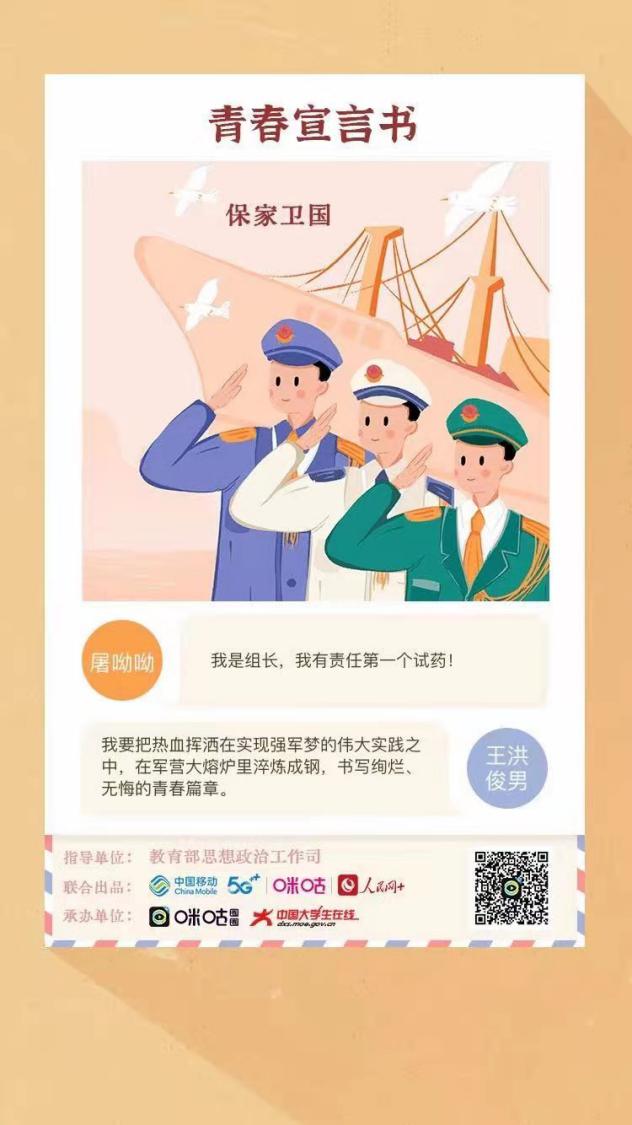 我要把热血挥洒在实现强军梦的伟大实践之中,在军营大熔炉里淬炼成钢,书写绚烂、 无悔的青春篇章。