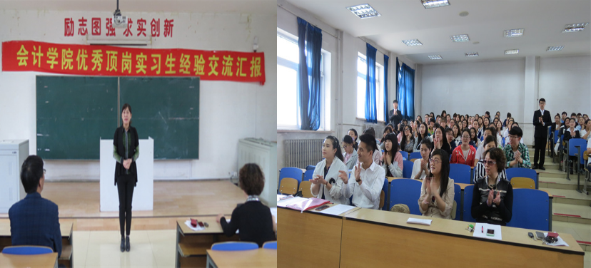 2016年5月11日中午12点,会计学院2016届毕业生顶岗实习经验汇报会在A教205教室隆重举行。参加本次汇报会的有:会计学院院长李昕教授、党总支书记付杰、副院长林冬梅、党总支副书记南洪吉、会“技”协会全体会员和大二的学生代表。汇报会由副院长林冬梅主持,来自万通药业的王鑫、来自修正药业的沙金涛、来自畅捷通公司的杨乐以及自主创业的刘亚男四位同学在汇报会上发言。他们在顶岗实习中分别尝试过销售、行政管理、会计以及社会服务等不同的岗位,通过个人的努力、领导的培养和岗位环境的历练,已经成长为单位中能够独挡一面的骨干力量。特别是杨乐同学以“一个普通女孩破茧成蝶的蜕变”为题,向大家展现了一个身体残疾但内心坚强的阳光女孩的成长历程。汇报人的精彩发言赢得了与会者一次次热烈的掌声。他们洋溢在脸上的笑容、融化在骨子里的自信、言语间流露出的从容与坚定,深深地感染着到会的每一个人。
