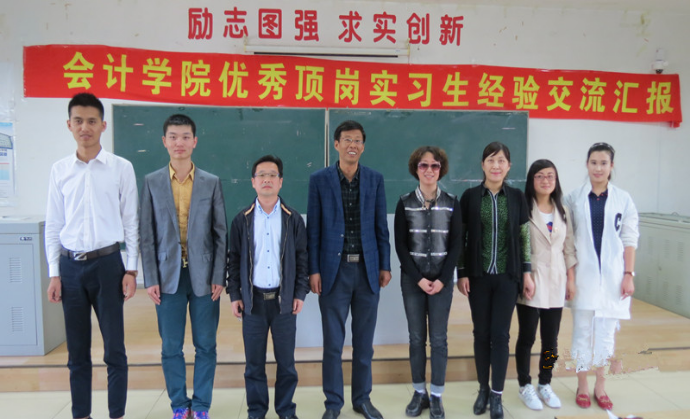 汇报会结束后,在大会上做经验交流的四位顶岗实习的学生代表与会计学院领导合影留念。