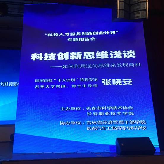 2017年04月21日,由长春市科协与长春职业技术学院主办、我院协办的“科技人才服务创新创业计划”专题报告会在长春蓝星宾馆隆重举行。大会邀请国家首批“千人计划”特聘专家、吉林大学教授、博士生导师张晓安先生作了题为《创新思维浅谈——如何逆向思维发现商机》主题报告。长春职业技术学院院长薛春志到会致词,长春职业技术学院党委书记张忠军、副院长赵有生,长春市科学技术协会副主席蔡卓研,我院高教科研处处长孙秋菱、创新创业学院院长蔡金明、经济管理学院院长林媛英、文化旅游学院院长刘韵凤、现代农业学院副院长刘春娟及我院近百名教师聆听了报告会。