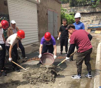 2018年6月接到学院工作安排,要求我分院结合实习实训教学为学院老干部活动中心的楼梯雨搭改造提供服务。接到任务后,在单旭、李震两位院长的带领下学院各位老师前往现场踏查,回来后由王新宇老师绘制了效果图,李震、倪楠老师绘制了施工图,吕丹老师编制了预算。在征得学院领导同意后建筑工程学院2016级装饰工程技术专业的同学们在建筑工程学院李震副院长和王楠老师的带领下,来到了位于南湖新村中街的省经济管理干部学院老干部活动中心,为活动中心的大门及台阶进行了施工与安装。师生一起有条不紊的忙碌起来,每一位同学都献出自己的一份力量。在此次活动中,装饰班的同学们既得到了动手实践的机会,又将书本中的理论知识转化为实践的提升,这对他们的学习能力的提高具有深远的意义。学院老年干部活动中心是离退休同志交流娱乐的场所,此次活动也体现了学院领导对离退休同志的关心和关怀,经过大家的共同努力,老干部活动中心的大门焕然一新,此次活动得到了离退休同志们的高度赞扬,大家都说同学们施工认真细致,真像一名合格的小工匠。