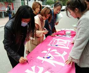 今年10.10精神卫生日“倡导积极心态 关注心理健康”的签名活动一开始就备受瞩目,在现场气氛的带动下,参加签名活动的学生越来越多,纷纷投入到签名活动中,让青春阳光的气息弥漫在校园里。尽管长春的天气十月初寒,但是寒冷的天气也没能阻止同学们参与活动的热情,活动持续了一个半小时,条幅上密密麻麻的布满了同学们的名字,同时也让学生们明确了心理健康的重要性及学习生活中要满怀“倡导积极心态 拥有快乐人生”的信念。同时此次签名活动也引得许多老师的关注与参与,路过活动现场的老师们也在条幅上签上自己的名字,表示对活动的支持与鼓励。