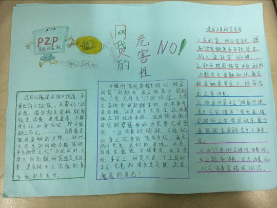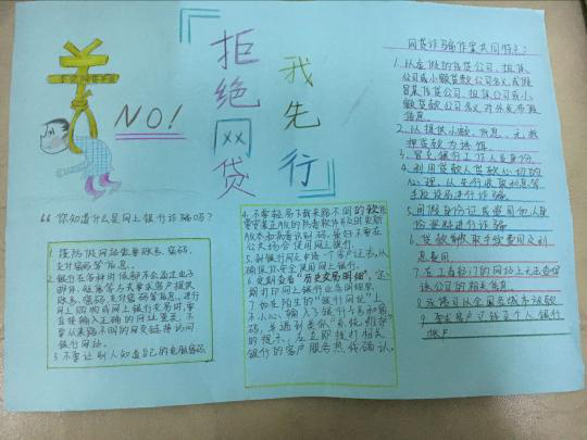 为了预防校园非法贷款行为发生,提高学生自我防护意识,机电工程学院于2016年11月28日至12月5日在全院范围内以手抄报的形式进行预防非法贷款宣传,2015级、2016级全体学生都参与了活动。