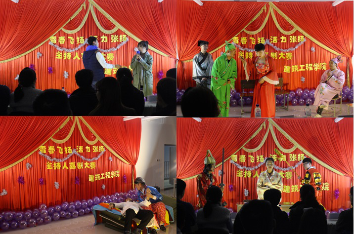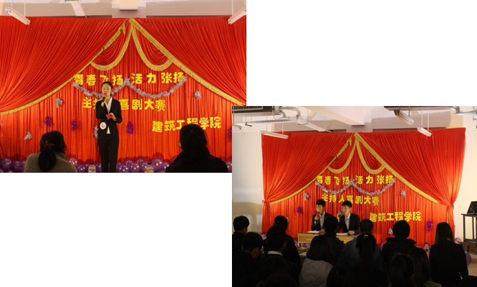 2016年11月23日下午2:30,由建筑工程学院主办的“青春飞扬、活力张扬”主持人喜剧大赛在高薪校区教学楼A306教室隆重举行,莅临的嘉宾有院学工处处长孙成雨、院团委杜思雨老师,分院党总支副书记李萍、吕小丽,团总支书记罗键宏以及辅导员贾妮莎、郭轩宇、兰颜、聂迪出席了此次大赛。