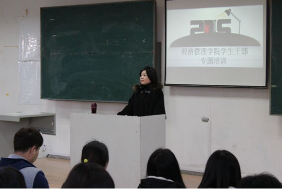 本次培训由经济管理学院党总支副书记杨玫就学生干部的工作方法、工作技巧、角色定位、团队协作、文明礼貌等方面,进行了详细的讲解。第一、作为学生干部要先学会做人,再学做事,最后是做干部;第二、学生干部要认真完成学习任务,同时在工作上,严于律己,宽以待人;第三、学生干部要具备无私奉献和吃苦耐劳的精神;第四、要提高组织协调能力、团队合作技巧;第五、全面提高综合素质,增强服务意识。