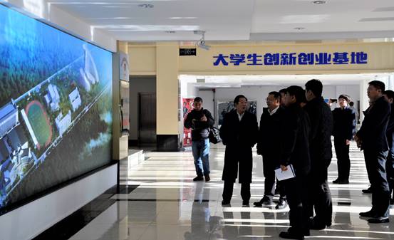 华景斌书记等领导在苏书记和费院长的陪同下,深入“创客吉林”园区,参观入驻企业和孵化企业的办公区域、智能制造和建筑工程创意实训工坊、绿色文化长廊,详细查看了解了“创客吉林”创新创业实训基地的发展历程、管理制度以及今后的发展规划。